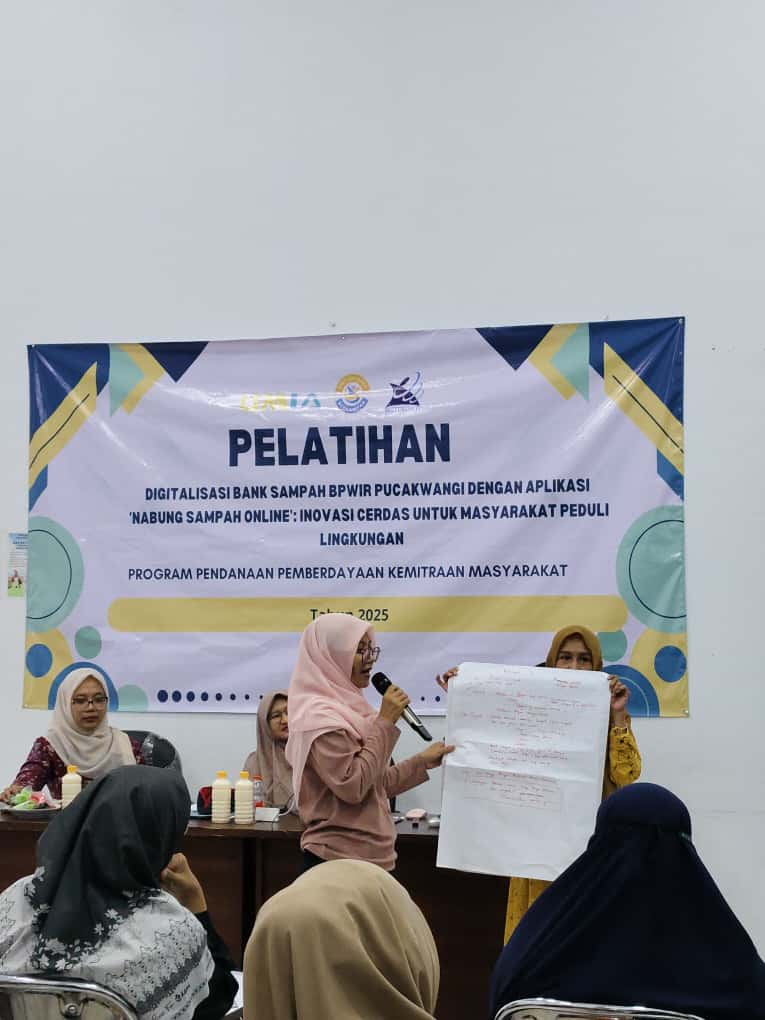 Wanita LDII Babat yang hadir tampak aktif mengikuti sesi, termasuk terlibat dalam diskusi kelompok serta presentasi hasil pemikiran tentang pengelolaan sampah berbasis digital.